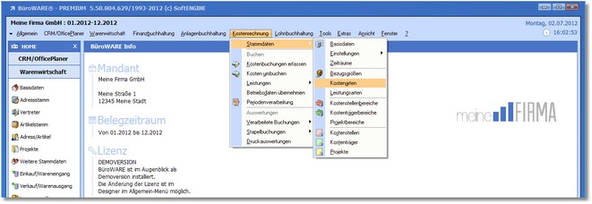 1. Klicken Sie mit der Maus im Hauptmenü auf "Kostenrechnung / Stammdaten / Kostenarten".