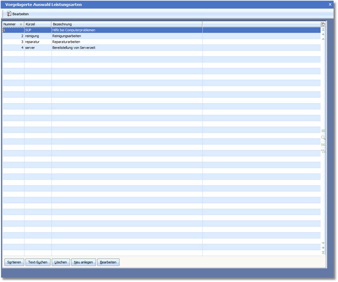 Das Programm öffnet die vorgelagerte Auswahltabelle der Leistungsarten.