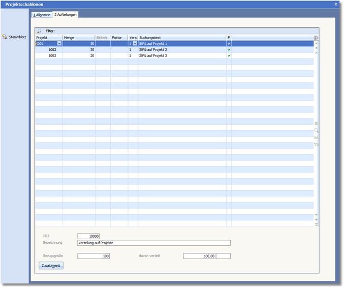 Bei einer Verteilung des Gesamtbetrags auf mehrere Projekte, müssen Sie als Menge den Anteil an der gesamten zu verteilenden Größe eingeben. Die Mengen aller Aufteilungen müssen zusammen den in der Karteikarte "Allgemein" angegebenen Bezugswert ergeben.