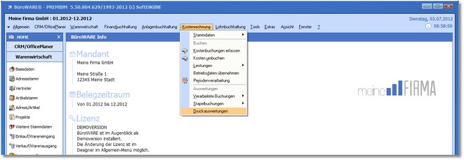1. Klicken Sie mit der Maus im Hauptmenü auf "Kostenrechnung > Druckauswertungen".