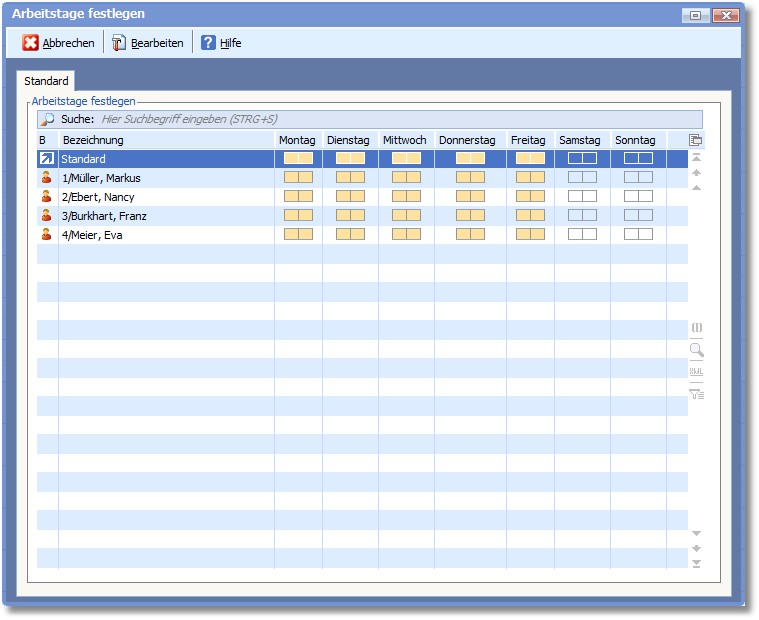 Hier können Sie für das gesamte Unternehmen bzw. für jeden einzelnen Mitarbeiter die Tage bestimmen, an denen volle oder halbe Tage gearbeitet werden bzw. an denen nicht gearbeitet wird.