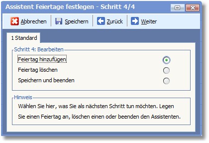 3. Wenn Sie keine weiteren Feiertage hinzufügen oder löschen möchten, wählen Sie die Option "Speichern und beenden" und klicken Sie anschließend auf <Weiter>.