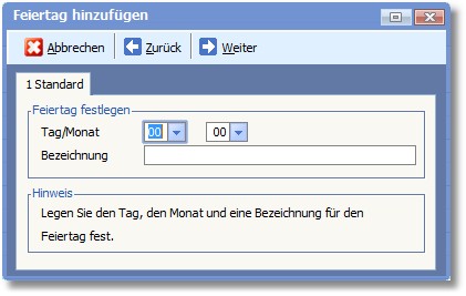 Wenn im Schritt 4 des Assistenten die Option "Feiertag hinzufügen?" gewählt wurde, wird im Anschluss dieses Fenster geöffnet.