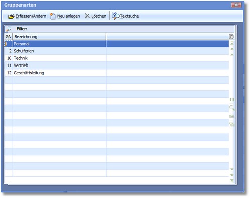 << Hier KLicken um eine Inhaltsübersicht anzuzeigen >> Navigation: CRM/OfficePlaner > Stammdaten > Weitere Stammdaten > Arbeitsgruppen > Gruppenarten |