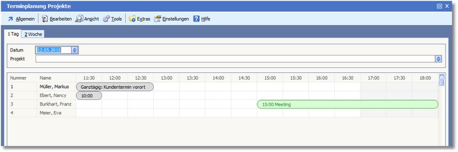 Unter dem Punkt "Projektplanung", den man in der Terminverwaltung über den Menüeintrag "Allgemein > Projektplanung" aufrufen kann, können Sie sich die einem auszuwählenden Projekt zugeordneten Mitarbeiter und deren Termine pro Tag bzw. Woche anzeigen lassen.