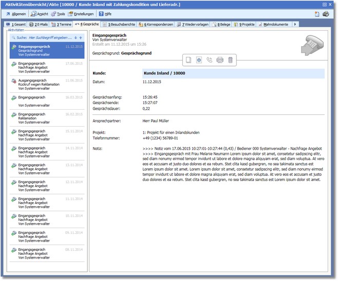 Mit dem Kunden geführte Ein- und Ausgangsgespräche inkl. Informationen zum Gespräch finden Sie auf der Karteikarte „4. Gespräche“. Hier werden Gesprächsnotizen, ggf. Projektinformationen für die Dauer des Gesprächs und vieles mehr angezeigt. Auch hier ist dank der HTML-Verknüpfung eine Interaktion direkt möglich, um den Kunden anzurufen bzw. neue Notizen zu erstellen.