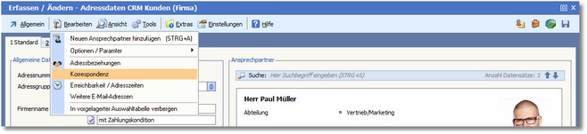 1. Klicken Sie in der Adressbearbeitung mit der Maus auf den Menüpunkt "Bearbeiten > Korrespondenz".