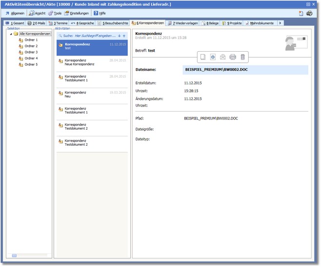 << Hier KLicken um eine Inhaltsübersicht anzuzeigen >> Navigation: CRM/OfficePlaner > Stammdaten > Adressstamm > Adressen erfassen/ändern > Die Karteikarte "Standard" (Firma) > Adressakte > Korrespondenzen |
