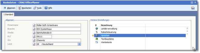Die Basisdaten - CRM/OfficePlaner werden geöffnet.