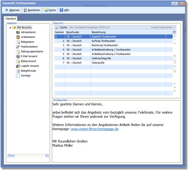 Textbausteine können in Notizfeldern verwendet werden und stehen z.B. innerhalb der Positionserfassung der Belege als Kommentarzeile zur Verfügung. Sie können auch für weitere Bereiche, bspw. in Belegformularen, für E-Billing oder E-Mails verwendet werden.