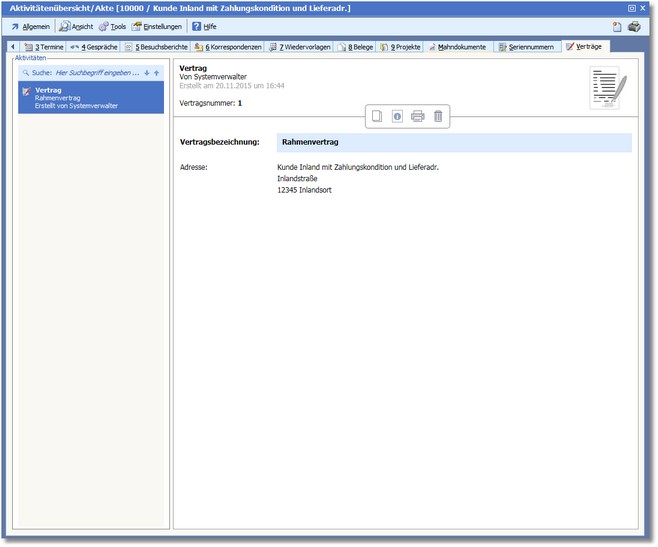 Nach Aktivierung der Karteikarte werden im Bereich "Aktivitäten" werden jetzt nur noch die der Adresse bereits zugeordneten Verträge angezeigt.