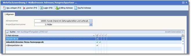 Wenn ein Ansprechpartner über mehrere eMailadressen verfügt, können Sie ihm hier weitere zuordnen.