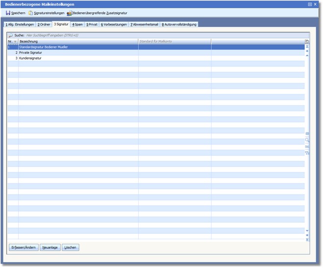 In der Signaturauswahlabelle können Sie verschiedene Signaturen hinterlegen und diese Signaturen verschiedenen Bereichen zuordnen. So können z.B. interne Mails eine andere Signatur erhalten als eine Mail, die einem Kunden zugeht.