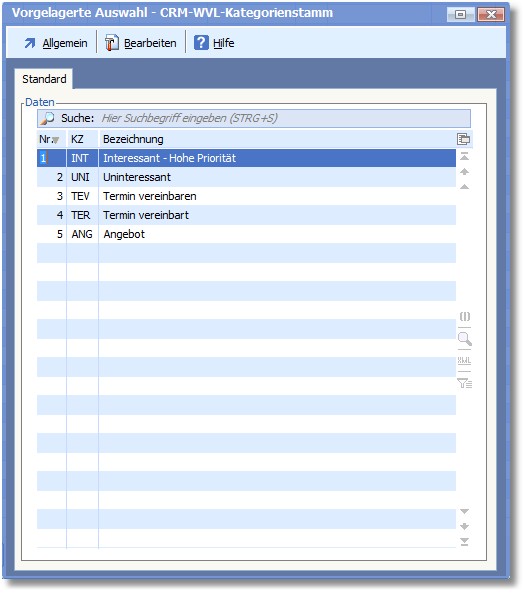 Das Programm öffnet die vorgelagerte Auswahl CRM-WVL-Kategorienstamm.