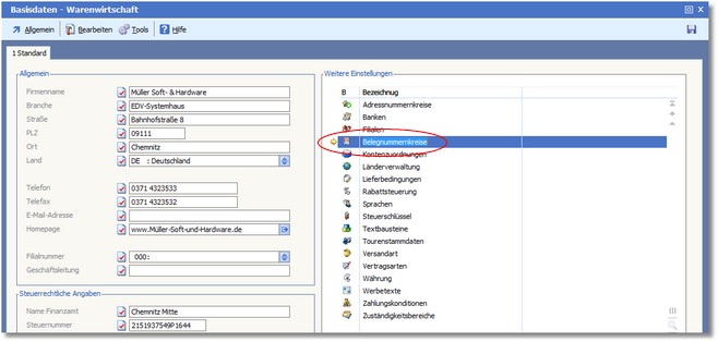 Durch Aktivierung der jeweiligen Karteikarten können Sie die Nummernkreise der Belegarten und Beleggruppen bearbeiten.