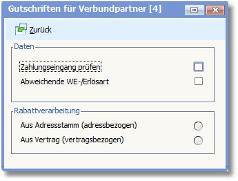 << Hier KLicken um eine Inhaltsübersicht anzuzeigen >> Navigation: Warenwirtschaft > Stammdaten > Basisdaten > Vertragsarten > Die Karteikarte "Standard" > Gutschriften für Verbundpartner |