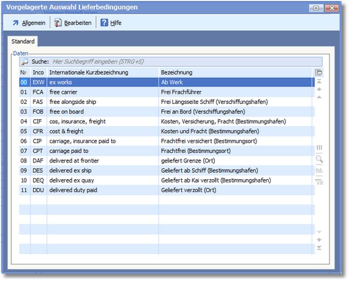 Das Programm öffnet die vorgelagerte Auswahltabelle der Lieferbedingungen.