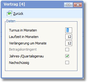 Tragen Sie hier ein, in welchem Zeitabstand der Vertrag ausgeführt werden soll. Der Zeitabstand ist in Monaten anzugeben (z.B. Berechnung alle 3 Monate > Eingabe: 3).