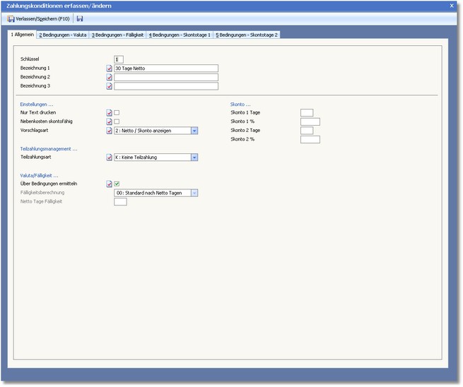 << Hier KLicken um eine Inhaltsübersicht anzuzeigen >> Navigation: Warenwirtschaft > Stammdaten > Basisdaten > Zahlungskonditionen > Zahlungskondition erfassen/ändern |