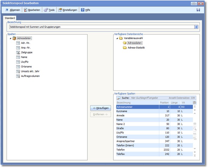 Der Selektionspool der vorgelagerten Auswahltabelle im Adressstamm dient als Sammelzentrum mit zusätzlichen Funktionen. Der Benutzer kann mit den im Selektionspool befindlichen Adressen weiter arbeiten, so können z.B. alle Adressen des Selektionspools mit jeweils nur einer Aktion einer Adressgruppe, Zielgruppe oder Branche zugeordnet werden.