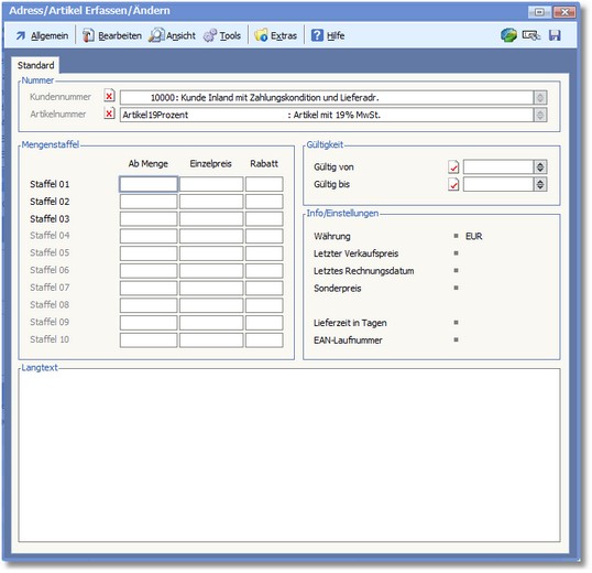 5. Erfassen Sie die Daten in den vorgesehenen Feldern und speichern Sie die neue Adress/Artikel-Kondition mit der Funktionstaste [F10].