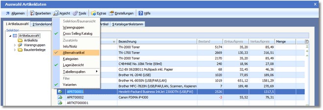 1. Klicken Sie in der Artikelauswahltabelle mit der Maus auf den Menüpunkt "Ansicht" und aktivieren Sie im Auswahlmenü die Option "Alternativartikel".