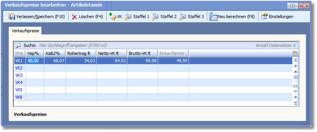 Hier können Sie Änderungen am Verkaufspreis direkt in die Tabelle eingeben. Lassen Sie anschließend den Verkaufspreis mit [F8] neu berechnen.