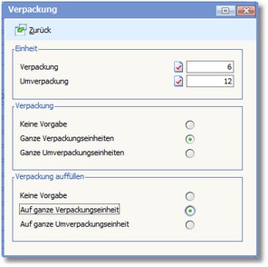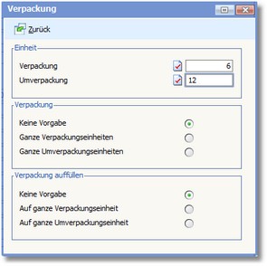 Hier können Sie durch Aktivierung des entsprechenden Radiobuttons festlegen, wie die Bestellmenge angepasst werden soll, wenn der Lieferant den Artikel ausschließlich in ganzen Verpackungs- bzw. Umverpackungseinheiten liefert. Sie sollten hier folgende Kombinationsmöglichkeiten verwenden: