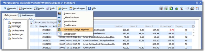1. Klicken Sie im Warenausgang mit der Maus auf den Menüpunkt "Extras > Vorkasseaufträge freigeben".