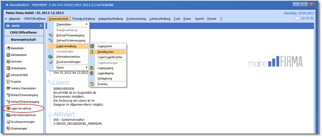 1. Klicken Sie mit der Maus im Hauptmenü auf „Warenwirtschaft > Lagerverwaltung > Bestellsystem".