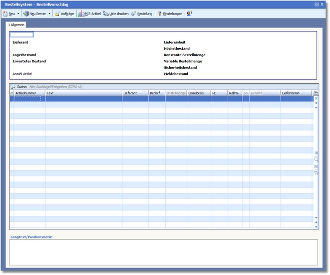 Das Programm öffnet eine leere Bestellvorschlagstabelle.