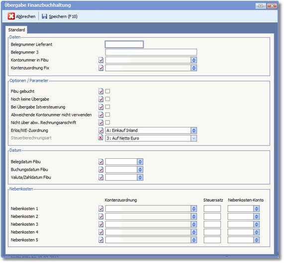 In diesen Feldern können Sie bis zu 5 Nebenkosten in der Belegwährung erfassen. Zu jedem dieser Kosten kann die Kontenzuordnung, ein Steuersatz und ein Nebenkosten-Konto eingetragen werden.