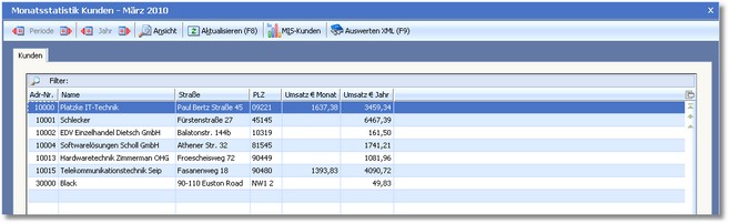 Bietet einen Umsatz und Rohertragsübersicht aller Kunden. Der Monat bzw. die Periode kann jeweils vor- oder zurückgeblättert werden, ebenso das Geschäftsjahr.