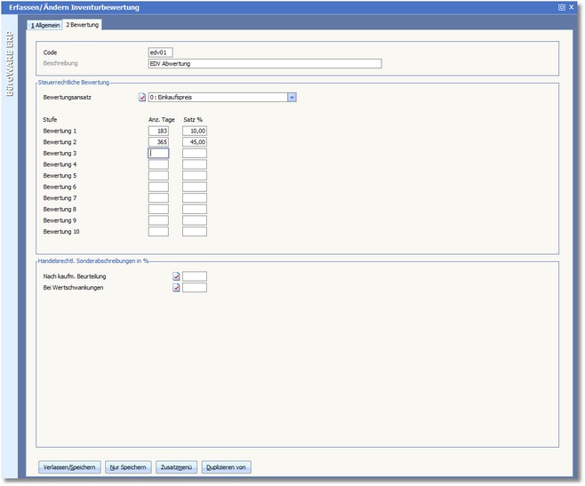 In diesem Falle bleiben die Bewertungsstufen mit den Lagerzeiten frei und Sie definieren nur den Basiswert. Im vor stehenden Beispiel wäre das der letzte Einkaufspreis.