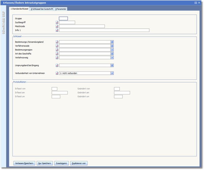 Tragen Sie hier einen eindeutigen Gruppenschlüssel ein. Dieser 5-stellige Schlüssel bildet das Such- und Ordnungskriterium der Intrastatgruppe.