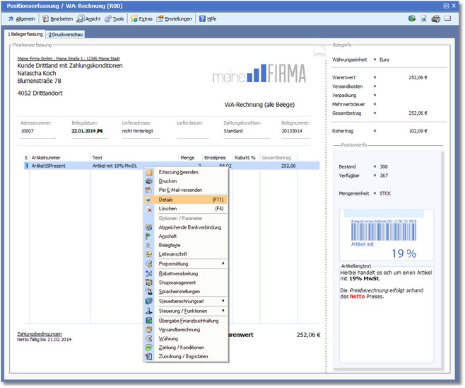 2. Erfassen Sie im Beleg eine Position und rufen Sie die Positionsdetails über das Kontextmenü der rechten Maustaste oder über den Menüeintrag "Bearbeiten > Details" bzw. mit [F11] auf.