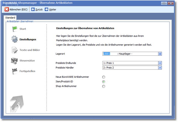 Der Einrichtungsassistent für die Artikelübernahme wird nun gestartet.