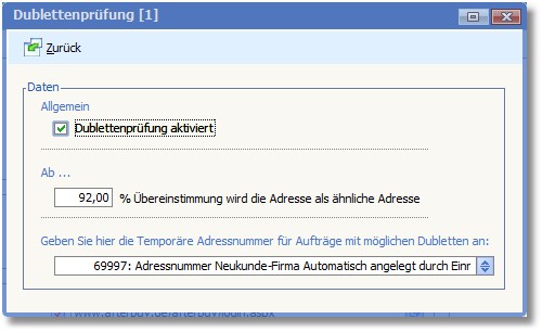 In dieses Feld kann eine Adressnummer eingetragen werden, auf welche Belege mit erkannten Dubletten verbucht werden sollen. Weiterhin wird in den betreffenden Belegen das Kennzeichen für eine mögliche Dublette gesetzt.