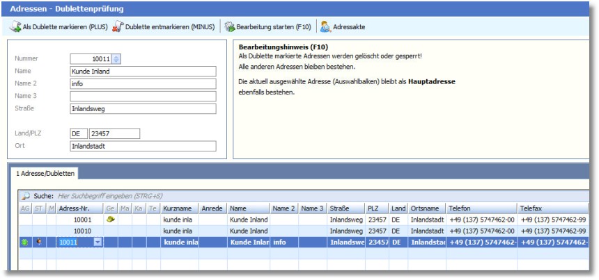 Mit [F10]-Taste wird die Bearbeitung gestartet. Als Dubletten markierte Adressen werden hierbei unwiderruflich gelöscht oder - wenn bereits Umsatz vorhanden ist - gesperrt.