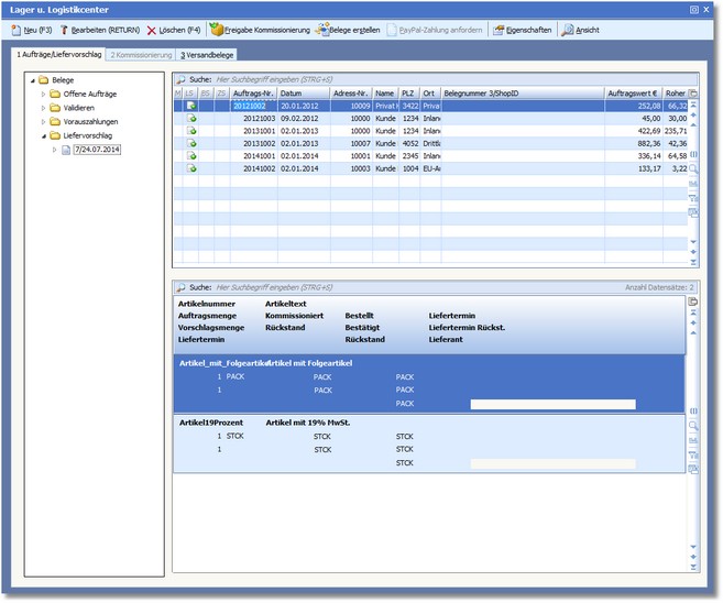 Das Programm öffnet das Lager- und Logistikcenter. Alle erstellten Liefervorschläge (Aufträge) werden im Verzeichnisbaum der Karteikarte "Aufträge/Liefervorschlag" angezeigt.