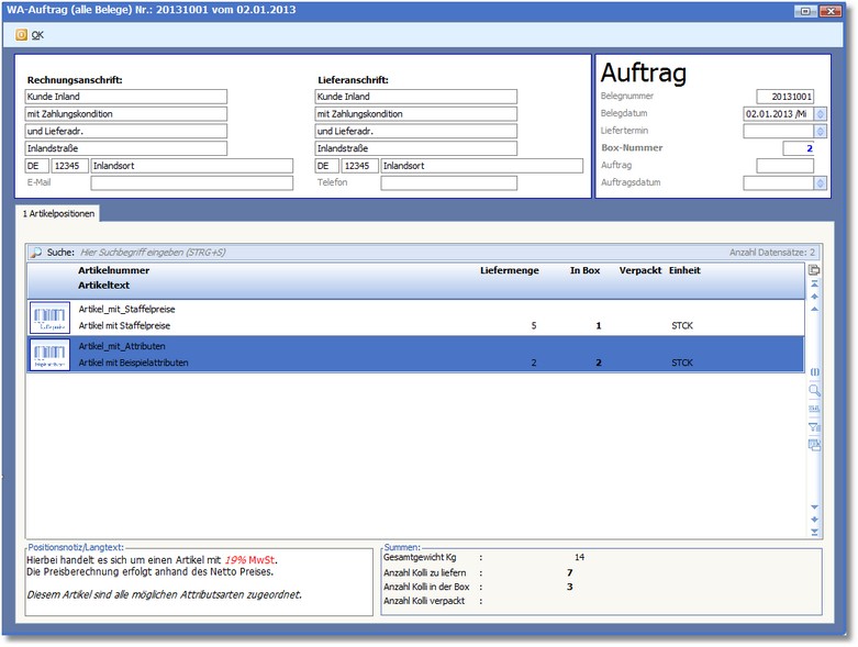 << Hier KLicken um eine Inhaltsübersicht anzuzeigen >> Navigation: Warenwirtschaft > Lagerverwaltung > Lager-/Logistikcenter > Packstation > Übersicht offene Aufträge > Details zum Auftrag |