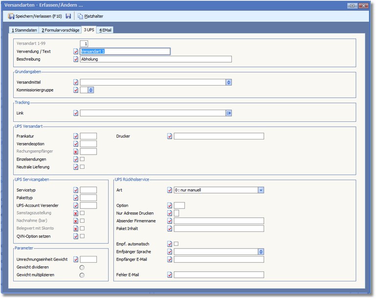 Der UPS-Account des Versenders kann auch im Adressstamm des Sendungsempfängers hinterlegt werden. Hierzu gibt es das Feld Kundennummer UPS Versender im Adressstamm.